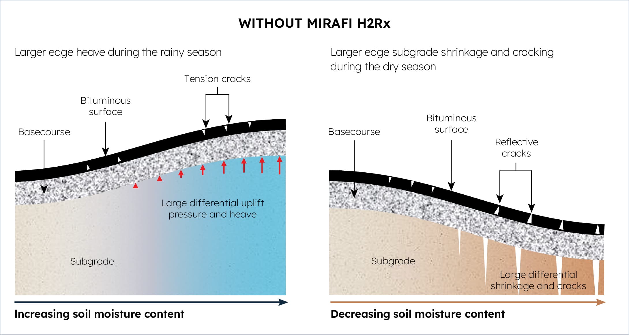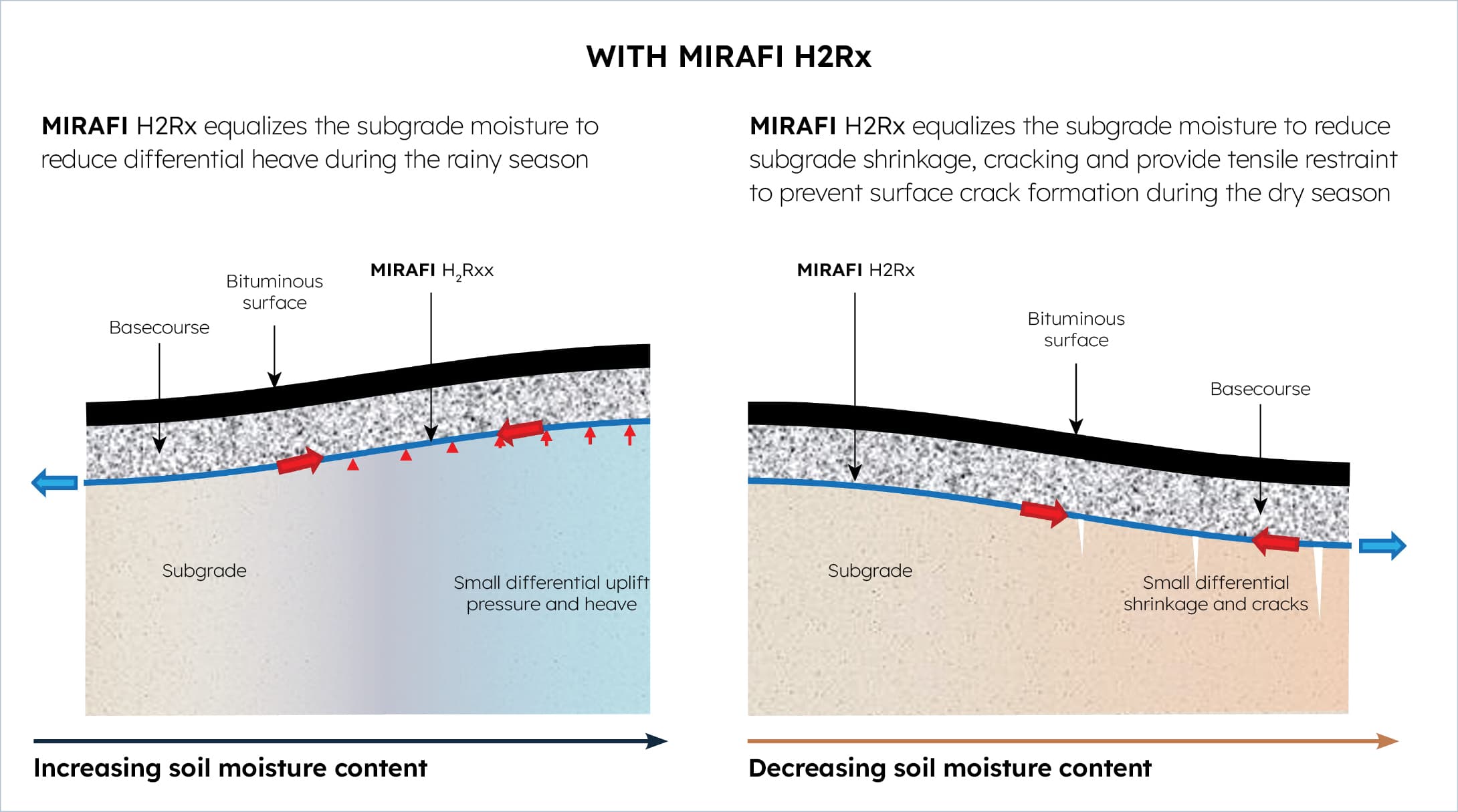 Directional drainage: Moisture moves from wet zones to dry zones, promoting balanced subgrade moisture levels and allowing water to exit the pavement structure when the geotextile terminates in a drainage layer or vegetated soil cover (Figure 5).