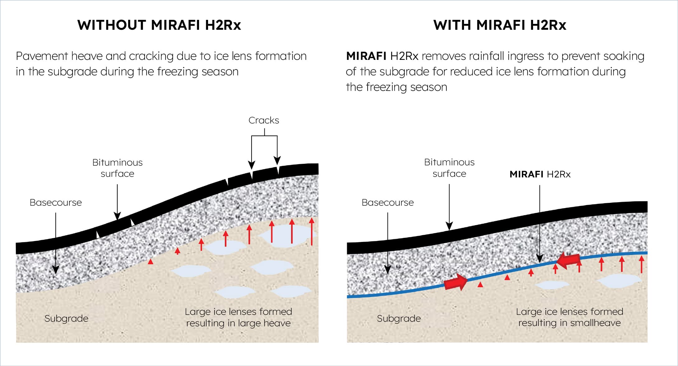 In regions with distinct seasonal changes, moisture in roadways can freeze, expand, and then thaw - creating damaging heaves and subsequent depressions. Capillary wicking technology helps mitigate this by keeping pavement water infiltration to a minimum. By maintaining a drier subgrade, moisture wicking geotextiles reduce the expansion potential during freezing and limit contraction during thawing (Figure 6).