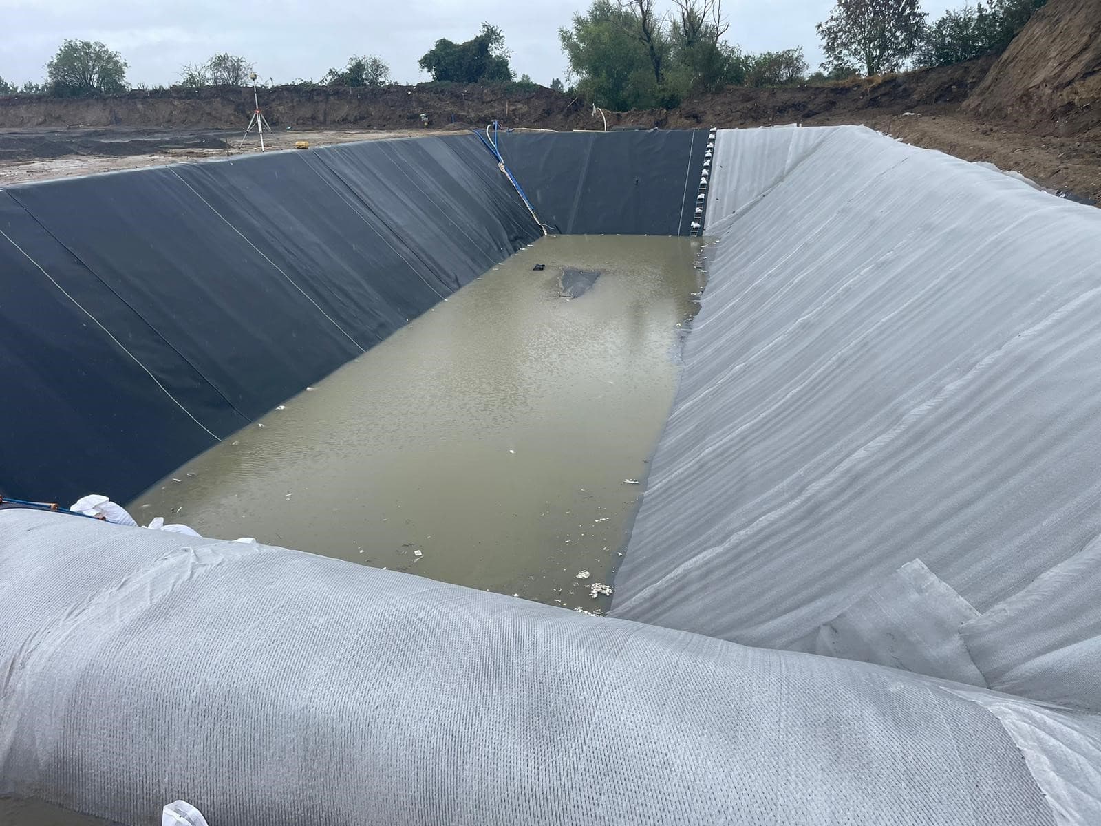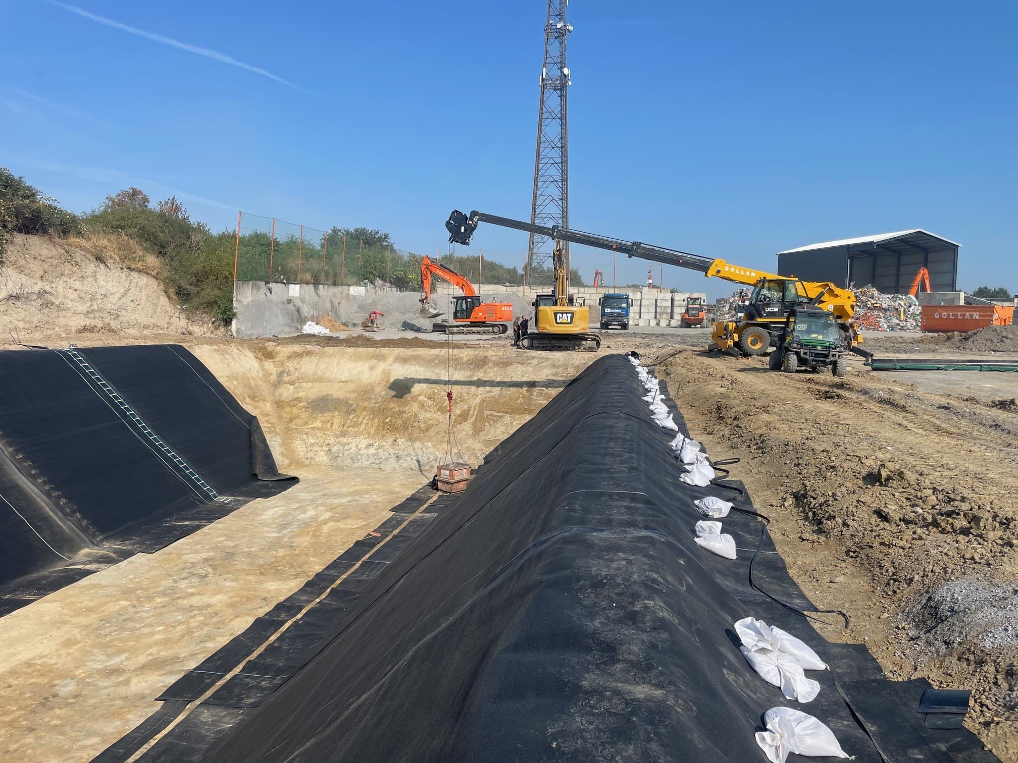 Solmax Germany provided a DIBt-certified double-lining system designed to ensure environmental protection and compliance. The solution comprised two layers of GSE® HD 2.0mm FrictionFlex DRS geomembrane, a structured high-density polyethylene liner offering exceptional chemical resistance and mechanical strength. With a total surface area of 3,000 m², this dual-layer configuration forms the primary containment barrier. Enclosed between the two geomembrane layers is the FABRINET® BP 50 1212 drainage layer, covering 1,500 m², which functions as a control and leak detection zone. This intermediate layer allows for continuous monitoring and facilitates the controlled collection of any seepage through a 90 mm drainage pipe (5.4 mm wall thickness), as shown in the site installation photos.