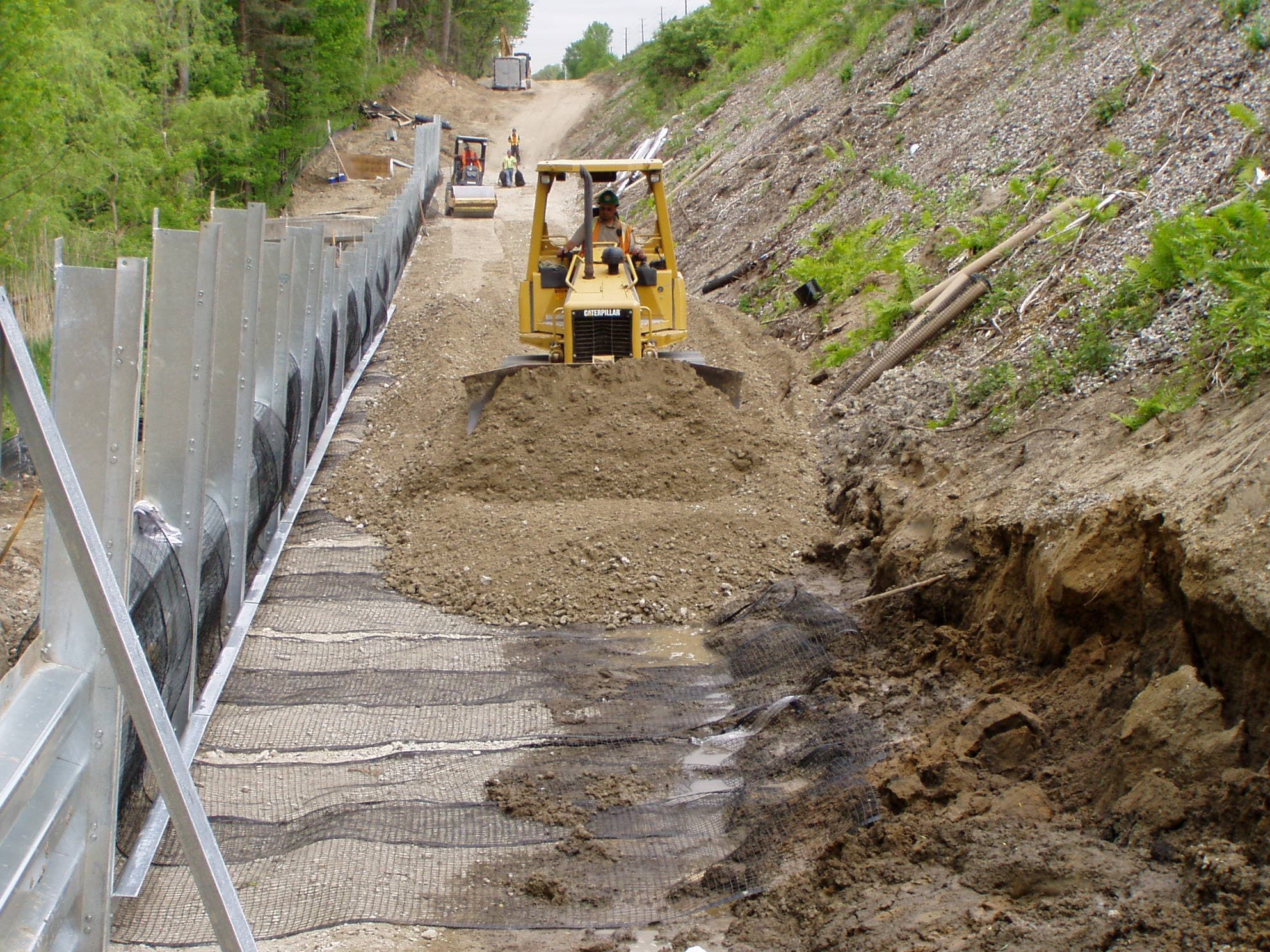 The geogrids were integrated with the galvanized steel crib wall fascia using a simple yet effective wrapping technique. This connection method ensured that the geogrids remained securely in place throughout the construction process, even under the high live loads imposed by the passing trains. The use of standard galvanized steel crib wall components for the fascia-to-geogrid connection further streamlined the construction process, reducing potential for errors and increasing overall efficiency.