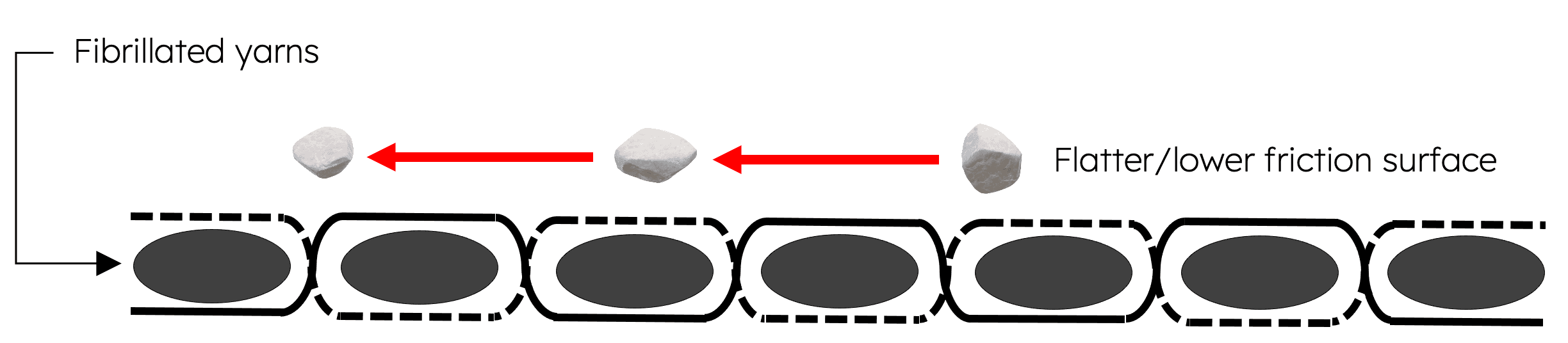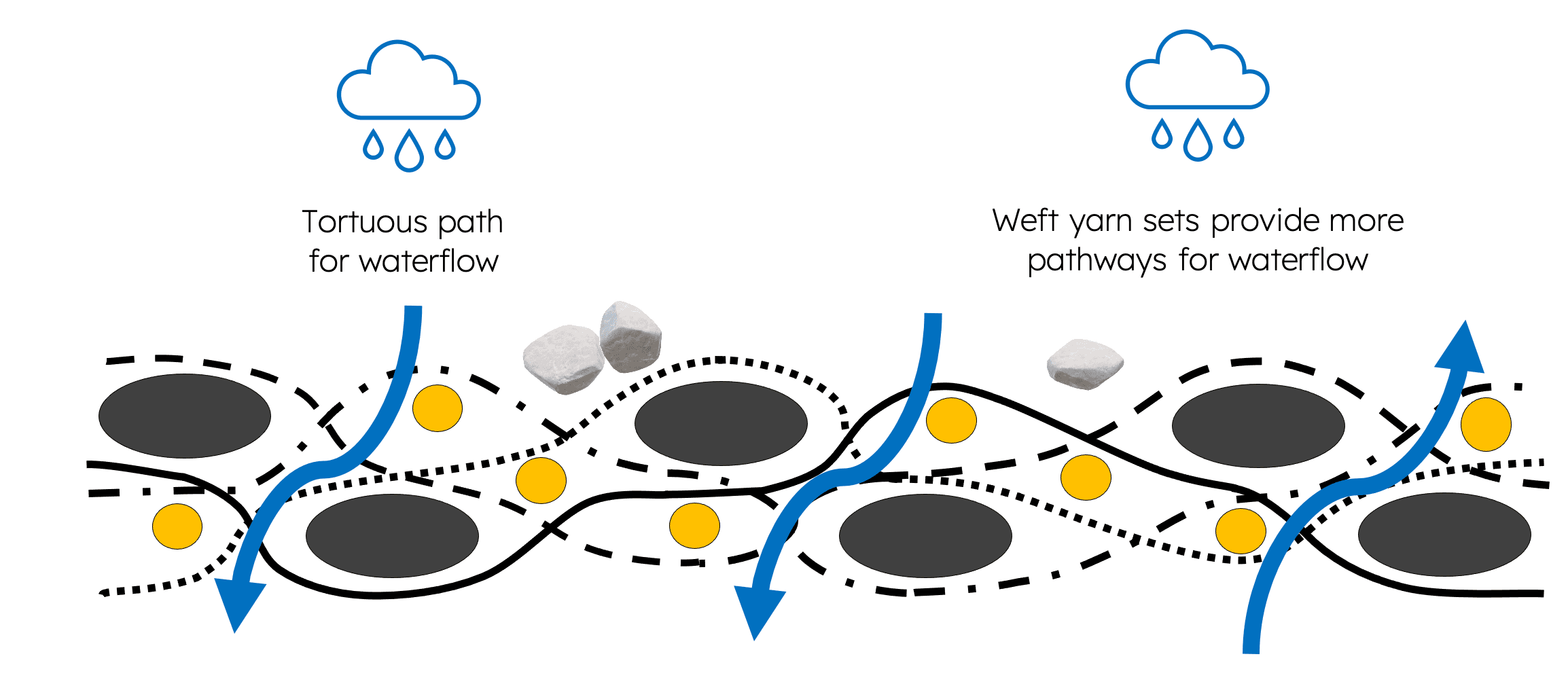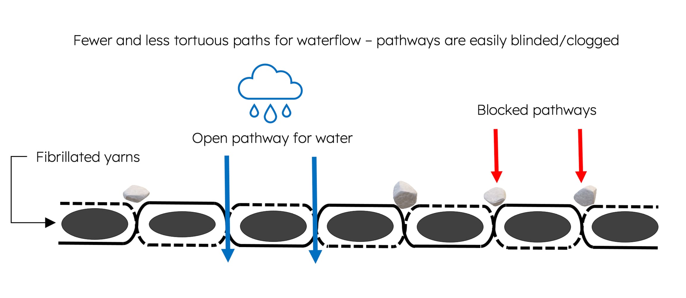 Figure 9: Cross sectional diagram of a typical woven geotextile with single-layer construction. This structure provides a straight, less tortuous path for waterflow through the geotextile