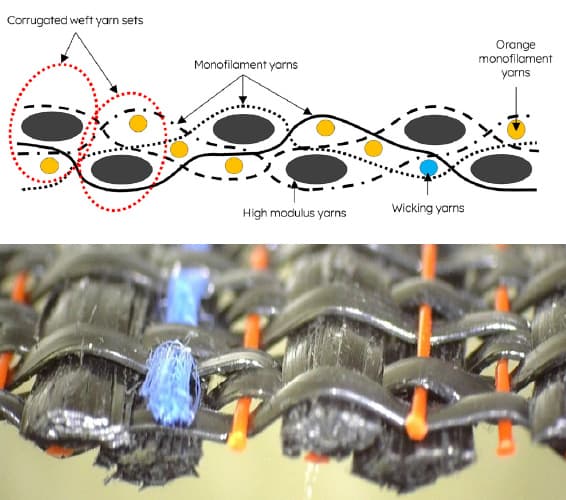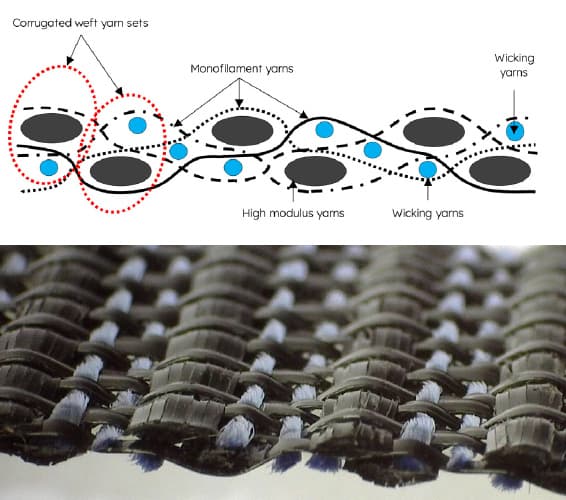 Figure 6: Cross sectional diagram and photo of MIRAFI H2Ri structure, illustrating wicking yarn placement